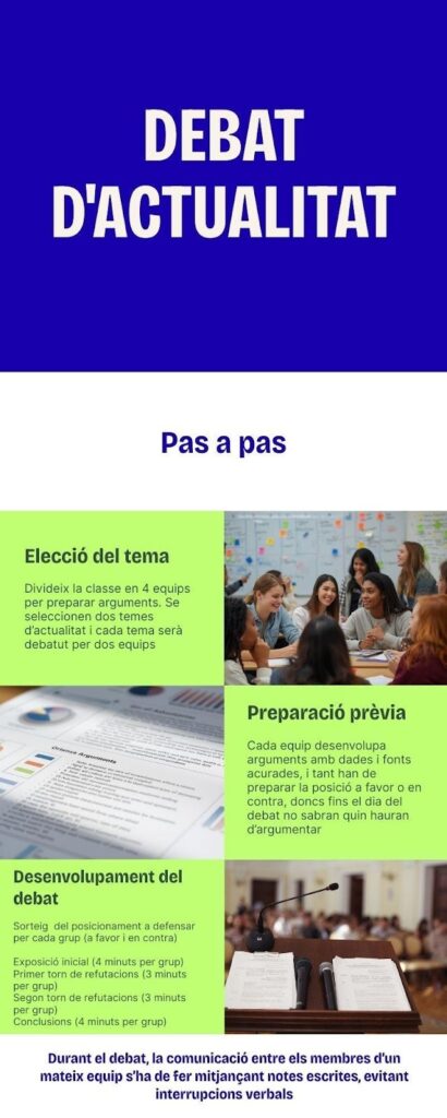Aquesta activitat permet treballar el debat no només com una tècnica oral, sinó com una pràctica democràtica, on l’alumnat aprèn a argumentar, discrepar i dialogar de manera informada i respectuosa.