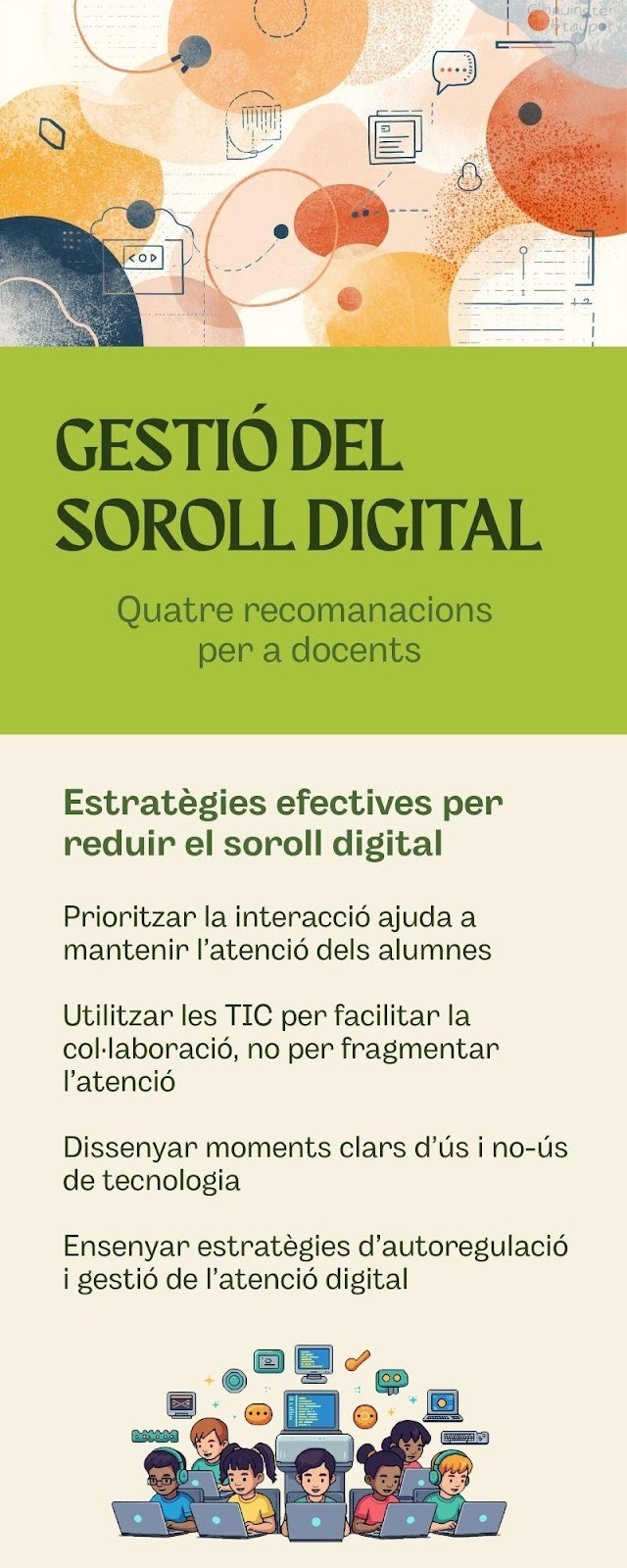En l’ecosistema informacional actual, els centres educatius i el professorat s’enfronten a un flux constant de dades i estímuls que sovint supera la capacitat humana de processament. Aquest fenomen, conegut com a soroll digital, s’ha intensificat amb la ubiqüitat dels dispositius mòbils i les xarxes socials, esdevenint un factor crític que afecta tant el rendiment acadèmic com el benestar emocional.