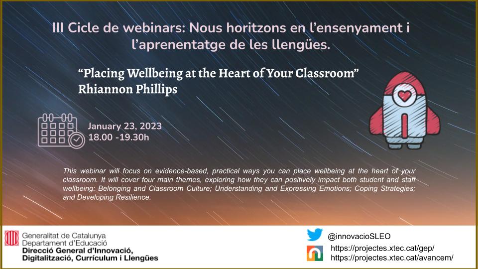 Dilluns 23 de gener a les 18:00h us esperem a la conferència de la Dra Rhiannon Phillips sobre la necessitat d’incloure estratègies per a la millora del benestar emocional de l’alumnat i del professorat a les aules dels centres educatius.