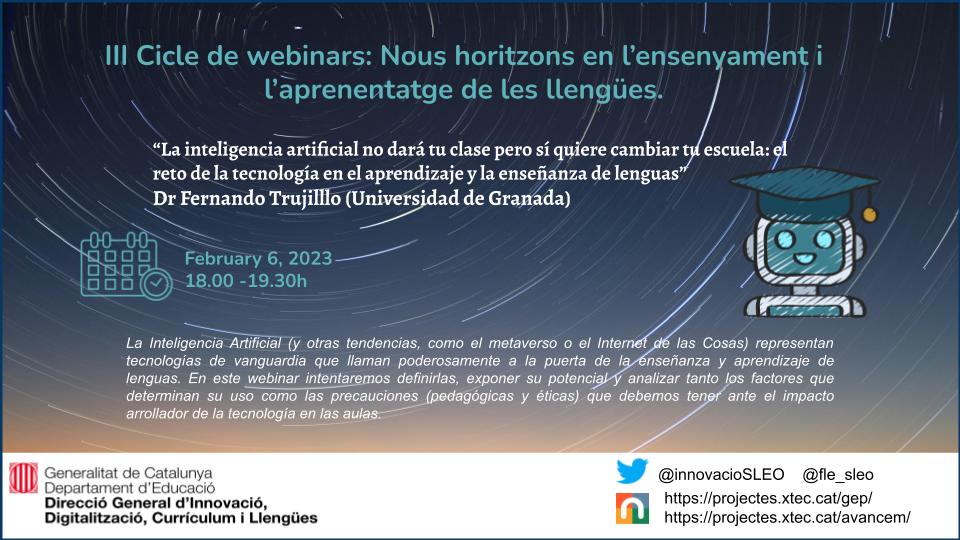 Dilluns 6 de febrer a les 18:00h podrem gaudir de la conferència del Dr Fernando Trujillo que ens parlarà de l’impacte imparable de la tecnologia a les aules, amb tots els beneficis que ens aporta i també les precaucions que cal tenir en ment per optimitzar l’ús de la tecnologia a les aules.
