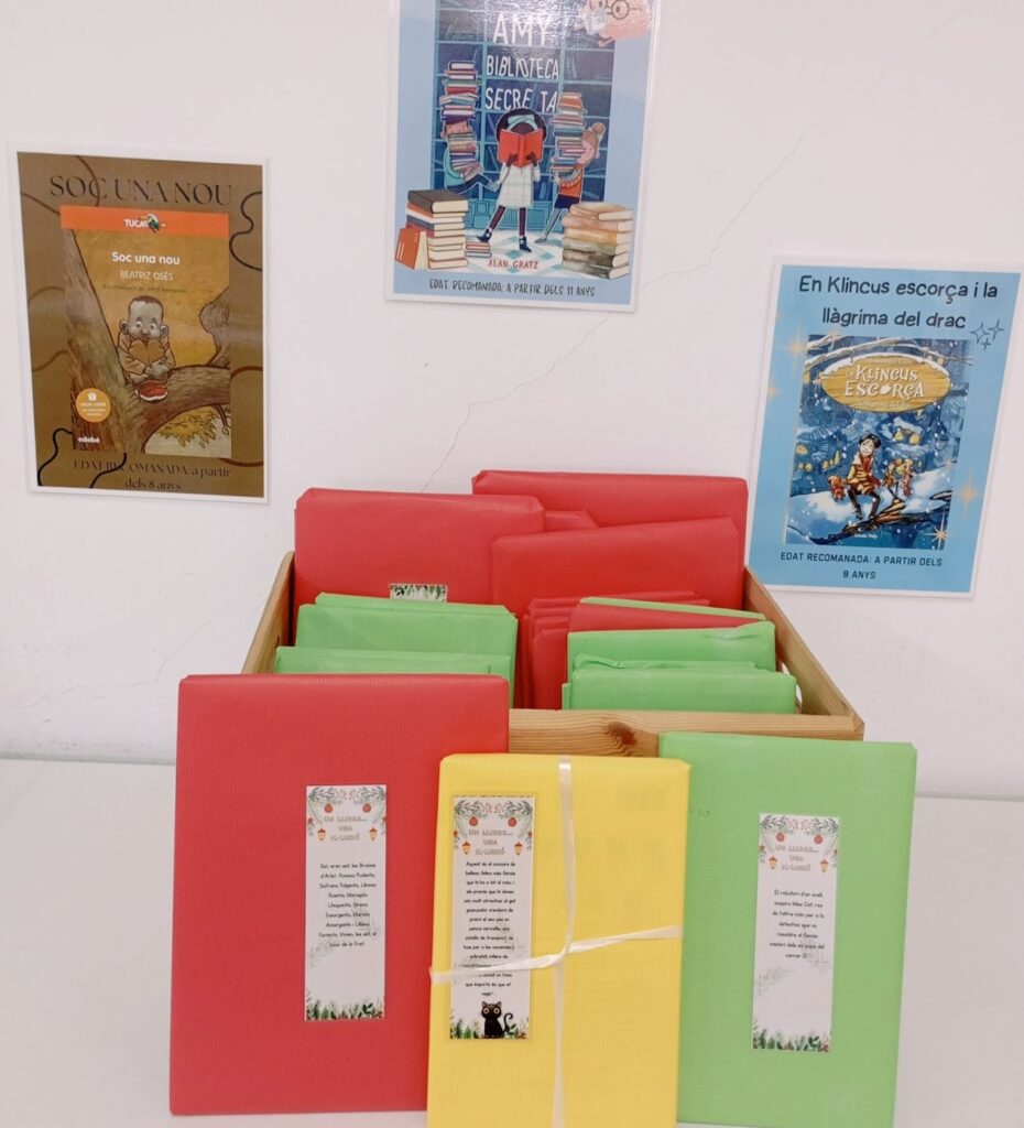 Durant les darreres setmanes del primer trimestre, la comissió de biblioteca i l’alumne de 4t d’ESO del Servei Comunitari van seleccionar amb cura un conjunt de llibres adequats per a cicle mitjà i superior de primària. Però aquests llibres no es van presentar de la manera habitual: estaven completament embolicats, com un regal, i només mostraven un punt de llibre amb un petit fragment o cita de l’interior. Aquesta és l’única pista que van tenir els lectors i lectores per escollir el seu llibre sorpresa!