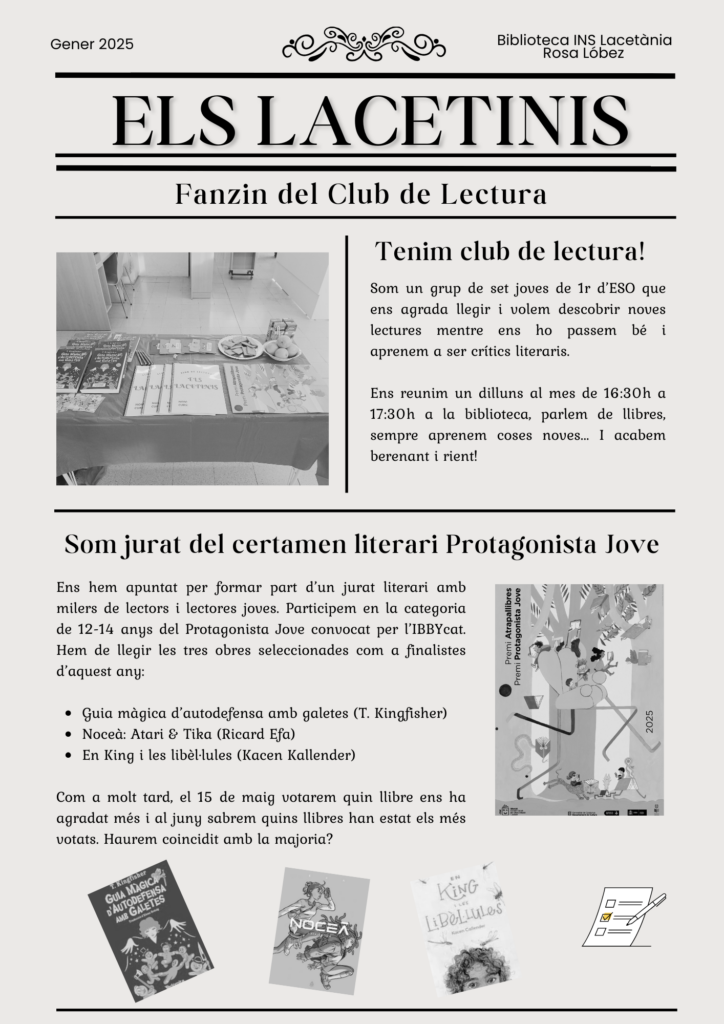 La Biblioteca Rosa Lóbez de l’Institut Lacetània ha impulsat una iniciativa creativa i enriquidora: un fanzín elaborat per la bibliotecària i els membres del club de lectura “Els Lacetinis”. Aquest club està format per set joves de 1r d’ESO que hi participen voluntàriament i que es reuneixen una tarda al mes per compartir el seu gust per la lectura. Enguany, a més, participen com a jurat als Premis Protagonista Jove 2025.