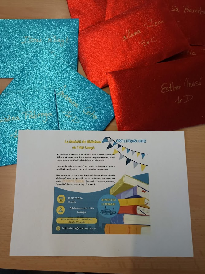 Es tracta del First {Literary} Dates, el restaurant de l’institut. No és un restaurant qualsevol, no: és un restaurant on t’enamores de la literatura, les històries, els móns màgics, la por, l’esperança, els assassins, els ninots, els éssers invisibles dels boscos, els pops gegantins de la Mediterrània. I, vés a saber, potser és un restaurant on t’enamoraràs del lector o lectora amb qui coincidiràs.
