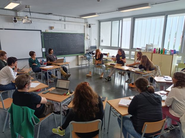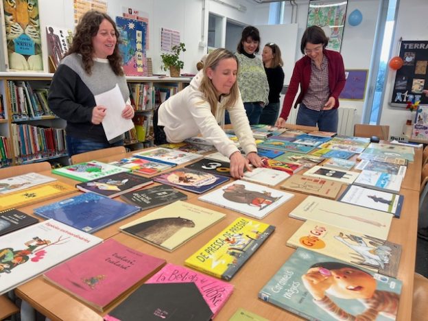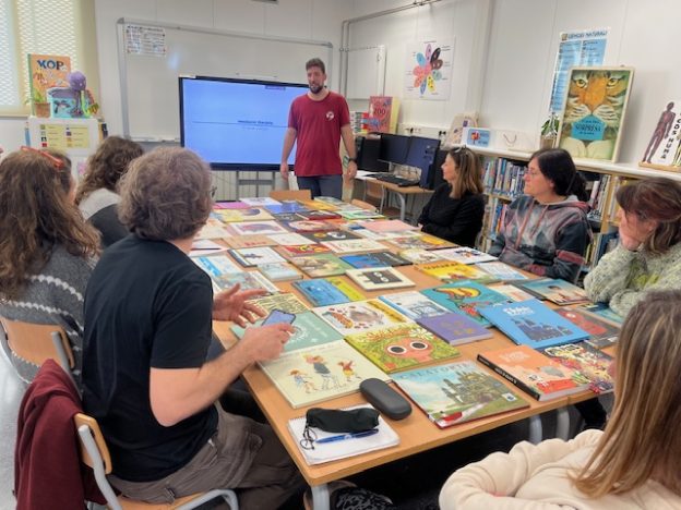 També van tenir l’oportunitat de poder fer una sessió amb en Guillem Fargas de la Cooperativa Tàndem parlant sobre les converses literàries amb els infants. En Guillem va venir ben carregat de llibres i, a partir d’una dinàmica on els mestres van ser els alumnes i van poder “remenar” bé entre tots aquests llibres, van reflexionar sobre quins aspectes podem parlar quan hem fet lectures tots conjuntament i com fer-ho per millorar les intervencions amb els infants i així poder extreure’n el màxim de profit.