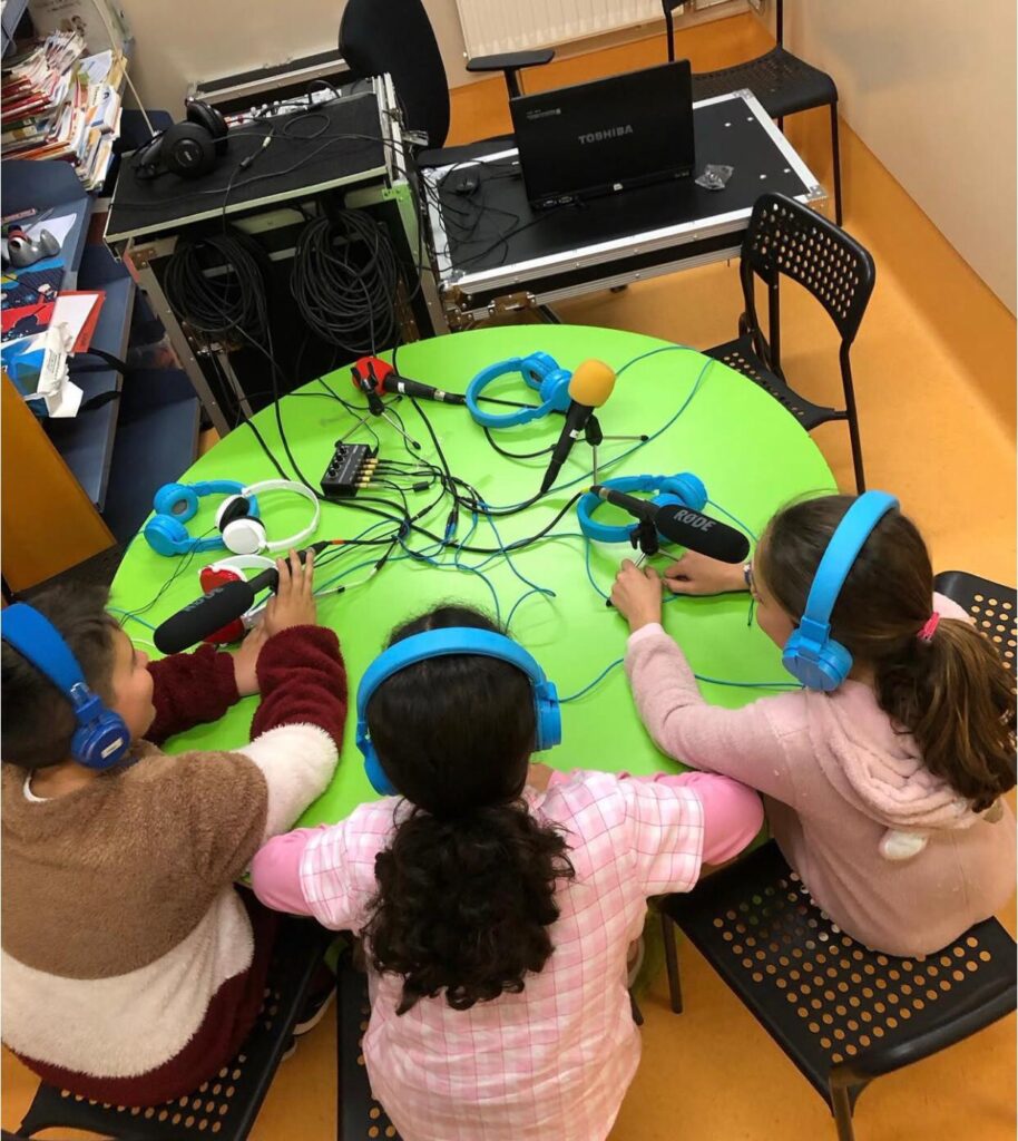Per la mainada és una bona feinada! Hi treballen durant tota la setmana per tal de decidir els continguts de la sessió, fer l’escaleta, preparar preguntes per les entrevistes (a alumnes d’altres cursos, mestres, personal de l’escola o convidats especials), dissenyar concursos… Les tutores són una peça clau per ajudar-los en tota la preparació. Els dimecres és el dia de gravació, que porten a terme a l’estudi de ràdio que tenen a l’escola i que dinamitza en Ferran, el seu expert en eines digitals. I no només cal preparar els continguts i els tempos del programa, sinó que també cal treballar en la dicció, el ritme i l’entonació perquè tot plegat sigui ben entenedor.