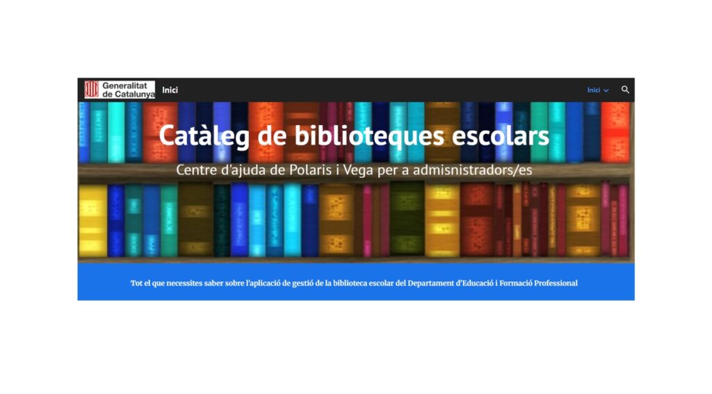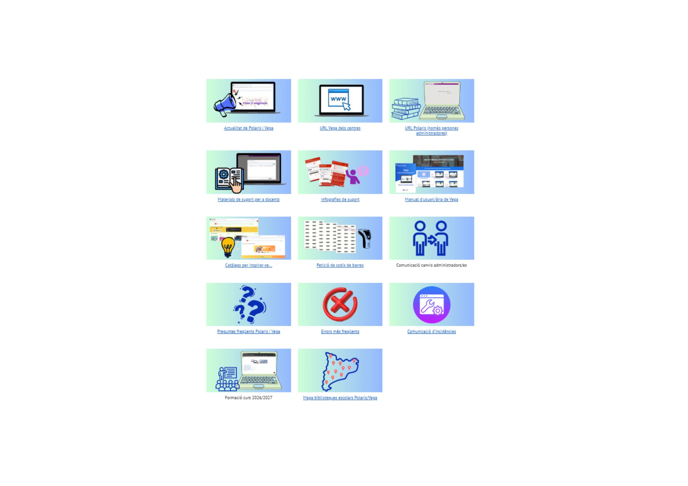 L’espai conté la informació agrupada per temàtiques: actualitat de Polaris i Vega, URL Vega dels centres, URL Polaris (només persones administradores), materials de suport per a docents, infografies de suport, manual d’usuari/ària de Vega, catàlegs per inspirar-se, petició de codis de barres, comunicació canvis administradors/es, preguntes freqüents Polaris i Vega, errors més freqüents, comunicació d’incidències. formació curs 2026/2027 i mapa biblioteques escolars Polaris/Vega.