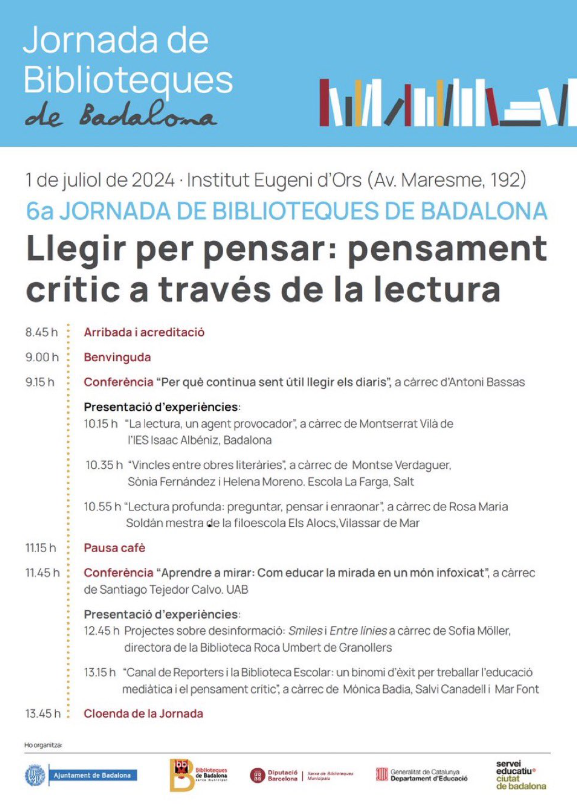 Avui hem participat en la 6a Jornada de biblioteques de Badalona. La jornada que portava per títol Llegir per pensar: pensament crític a través de la lectura s’ha dividit en dues parts. Cadascuna de les parts s’ha iniciat amb una conferència, la primera a càrrec d’Antoni Bassas i la segona de Santiago Tejedor. Després de cada conferència s’han compartit experiències i l’última d’aquestes ha sigut la col·laboració que hem fet aquest curs amb Canal de reporters.