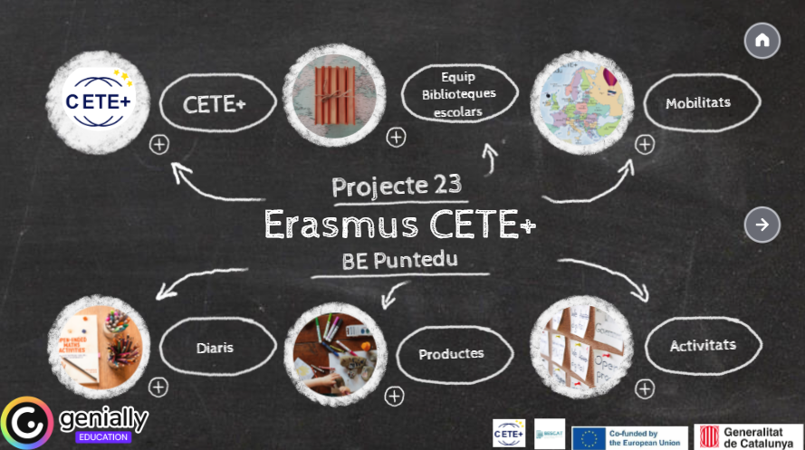 Aquest Genially recull el projecte 23 de l’equip de BE (Biblioteques escolars) Puntedu, erasmusbescat, Erasmus CETE+. Hi trobareu informació del CETE, del nostre equip de biblioteques escolars, les mobilitats, els diaris publicats, els productes que s’han creat i les activitats realitzades.