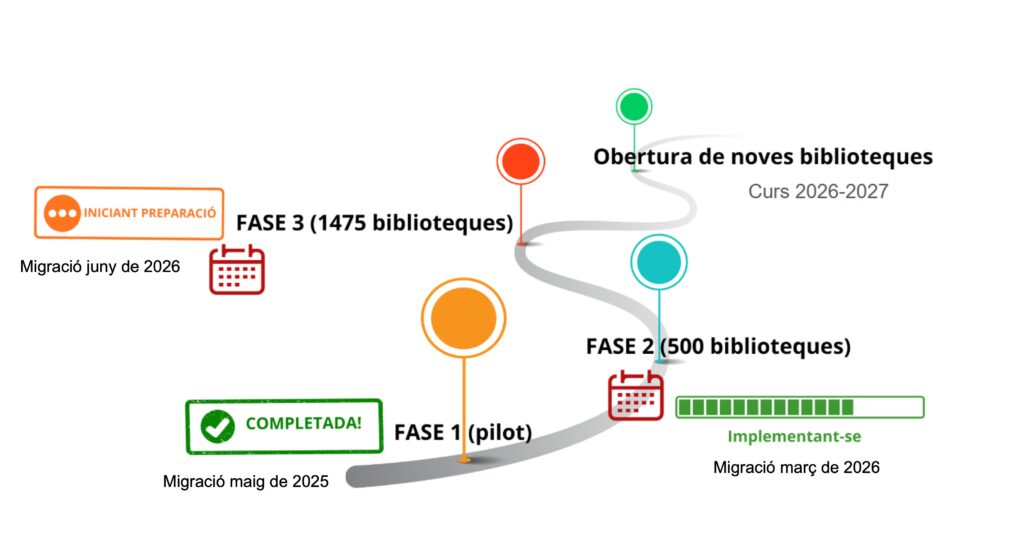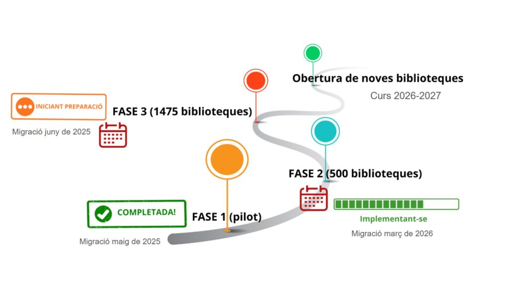En aquests moments del procés d’implantació del nou programari, l’equip de biblioteques escolars segueix donant suport als centres de fase pilot i fase 2 i continua amb la formació als centres de fase 2. La nova etapa 一la fase 3, amb 1.500 centres educatius一 s’iniciarà al mes d’abril amb una sessió informativa i formació telemàtica, i culminarà al mes de juny.
