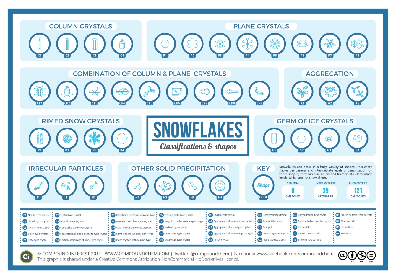 Històricament, els científics han intentat classificar aquesta diversitat. Amb el temps, el nombre de categories de formes de cristalls de neu ha anat augmentant, i avui dia s’hi reconeixen centenars de variacions en funció de les condicions de creixement.