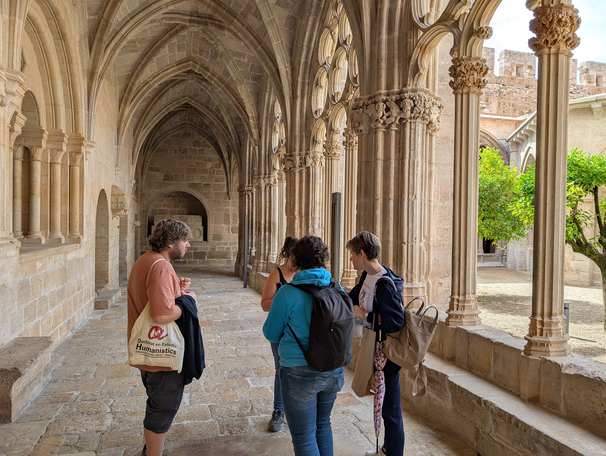 La formació es va vertebrar seguint la cronologia de la construcció del monestir. El punt d’inici: el claustre. La investigadora Povill va explicar les transformacions impulsades per Jaume II, que van suposar el pas del claustre romànic inicial a l’actual claustre gòtic, finalitzat l’any 1341, vint anys després de la mort del monarca. En aquest punt, va mostrar als docents les restes arqueològiques que permeten explicar a l’alumnat com van canviar els espais i els accessos arran d’aquesta ampliació. Un exemple són els arcs apuntats descentrats o les fornícules amb les tombes dels nobles que estaven enterrats prèviament a l’arribada de la reialesa.