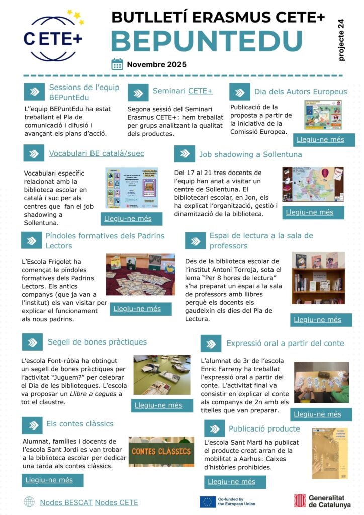 El butlletí de l’equip BEPuntEdu Erasmus CETE+ us informa mensualment de les activitats i notícies del projecte de l’equip de biblioteques escolars.