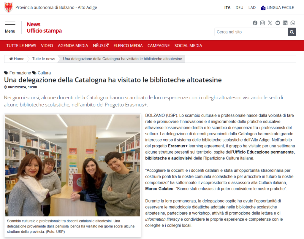 Després de la mobilitat a Bolzano que va fer un grup de mestres i una tècnica docent s’ha publicat un comunicat de premsa al News Ufficio stampa sobre la visita.