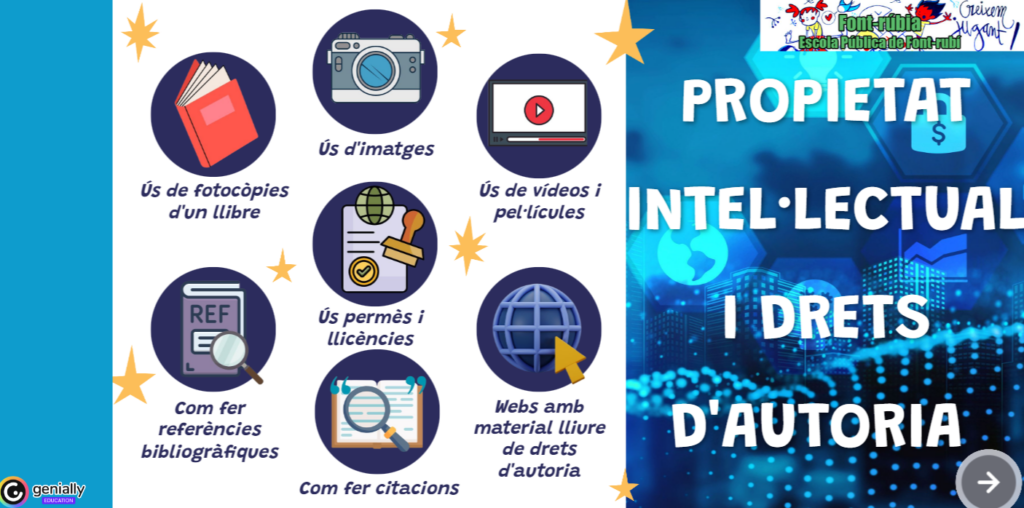 El Genially detalla temes relacionats amb la propietat intel·lectual i els drets d’autoria. Des de la biblioteca escolar es vol donar resposta als dubtes que puguin sorgir i, a la vegada, formar alumnat i claustre perquè que tinguin presents aquests aspectes i en facin un bon ús.