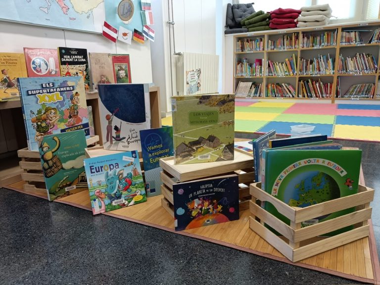 A l’entrada de la biblioteca hi tenen una àmplia exposició amb llibres de coneixement, per totes les edats, referents a Europa, diferents atles il·lustrats i lectures significatives d’autors que són referència a diversos països de la Unió Europea. També hi ha un racó amb llibres infantils escrits en diferents llengües: francès, búlgar, portuguès, italià, anglès…