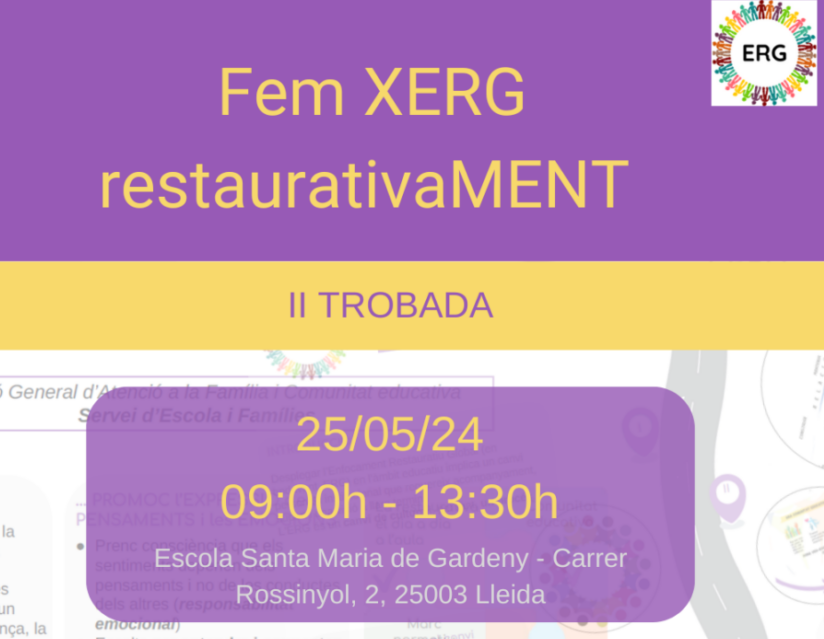 Des del Servei d’Escola i Famílies us volem convidar a la II Trobada de la XERG: Fem RestaurativaMENT, que organitza l’equip tècnic del Programa d’Enfocament Restauratiu Global. La jornada tindrà lloc el pròxim dissabte 25 de maig de 9:00 h a 13:30 h a l’Escola Santa Maria de Gardeny (Lleida). Us adjuntem el programa amb […]