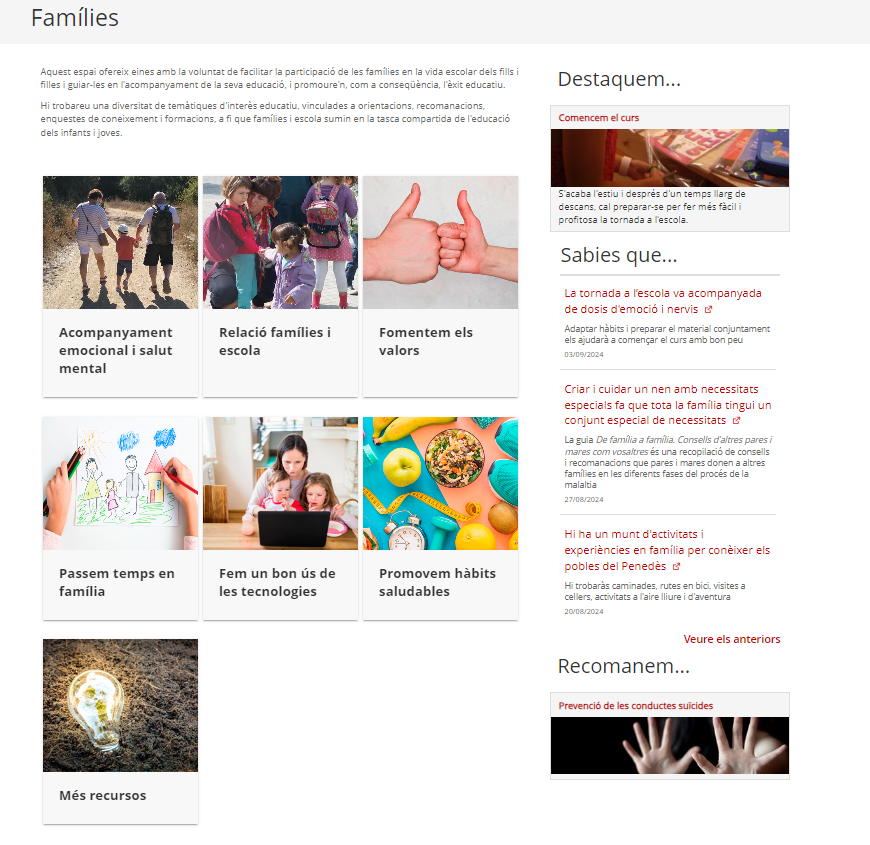 Eines per facilitar la participació de les famílies en la vida escolar dels fills i filles i guiar-les en l’acompanyament de la seva educació, i promoure’n, com a conseqüència, l’èxit educatiu.