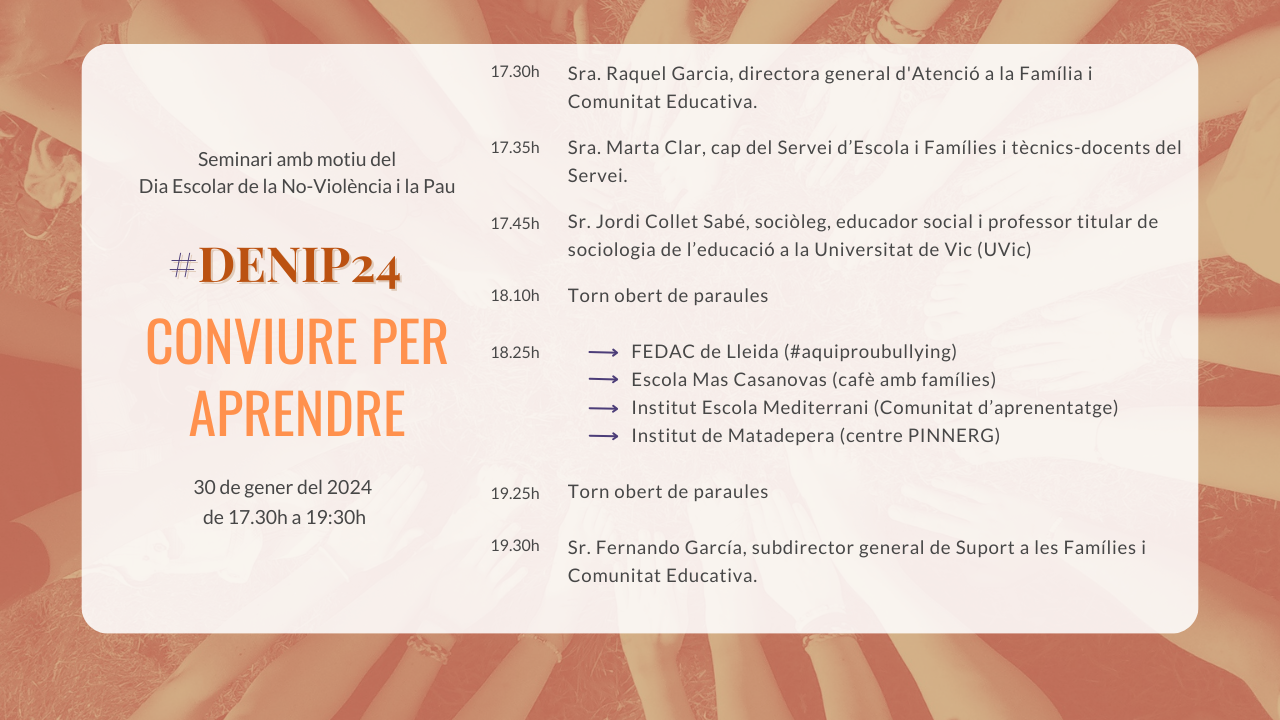El Departament d’Educació impulsa la celebració del Dia Escolar de la No-violència i la Pau (DENIP). Des del Servei d’Escola i Famílies proposem un seminari que vol incidir en la col·laboració dels centres educatius amb les famílies en relació amb la No-violència i la Pau. Comptarem amb la participació del Sr. Jordi Collet Sabé, sociòleg, […]