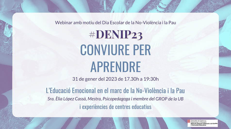 Dia Escolar de la No-violència i la Pau La finalitat d’aquesta sessió és reflexionar entorn a la No-Violència i la Pau, el dia posterior de la celebració oficial del DENIP. En aquesta ocasió, i emmarcat dins els vectors de benestar emocional i de ciutadania democràtica i consciència global, volem incidir en l’apartat d’educació socioemocional que