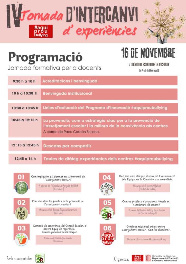 El pròxim 16 de novembre de 9:30 a 14 h tindrà lloc la IV Jornada d’intercanvi d’experiències #aquiproubullying a l’Institut Estany de la Ricarda (el Prat de Llobregat).