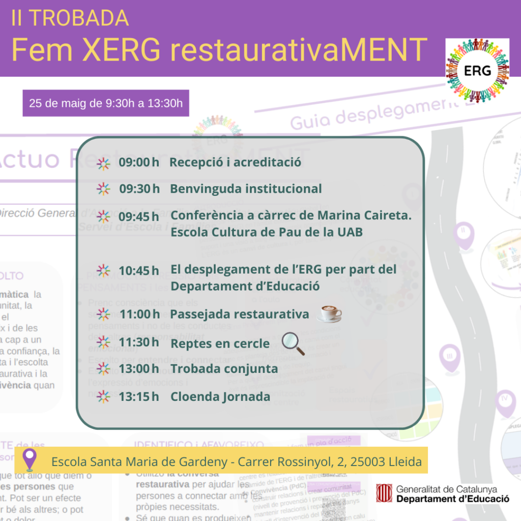 Us animem a participar i gaudir de tots els moments previstos durant el matí, on actuar restaurativaMENT es concretarà gràcies a les exposicions de cartells i lones de tots els centres educatius participants de la xarxa. Us convidem a ser-hi presents per gaudir-ne i construir col·lectivament REPTES EN CERCLE.
