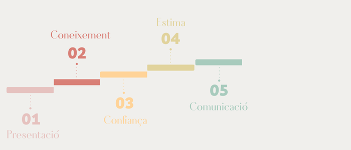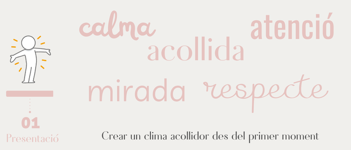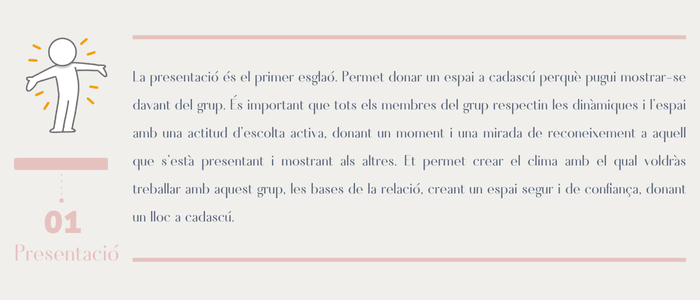 O bé, podem crear un espai on aquesta presentació sigui significativa per a ells i elles, un espai de presentació real entre alumnat, on es puguin mirar als ulls i reconèixer, intercanviar un somriure i, si poden, més paraules, un dibuix, un gest, una fotografia, un objecte, donar lloc a l’inici de la connexió. Una dinàmica on hi hagi presència real. Aquesta presentació determinarà l’inici del vincle, i caldrà anar-la repetint i deixant espais diversos a presentar-se de diferents maneres, des de l’interior a l’exterior. La forma més senzilla de fer-ho és generant grups de 3 persones, cadascú ha de fer el següent: