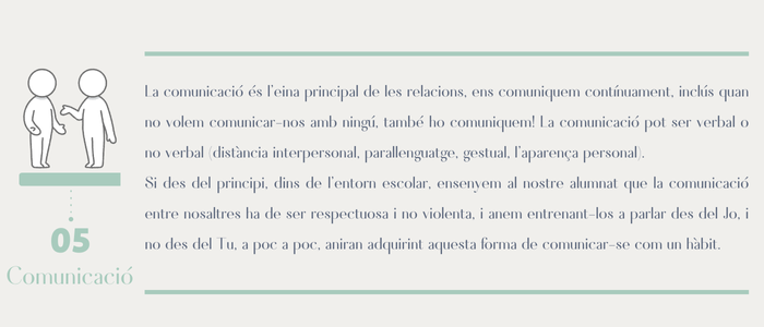 Si des del principi, dins de l’entorn escolar, ensenyem al nostre alumnat que la comunicació entre nosaltres ha de ser respectuosa i no violenta, i anem entrenant-los a parlar des del Jo, i no des del Tu, a poc a poc, aniran adquirint aquesta forma de comunicar-se com un hàbit.