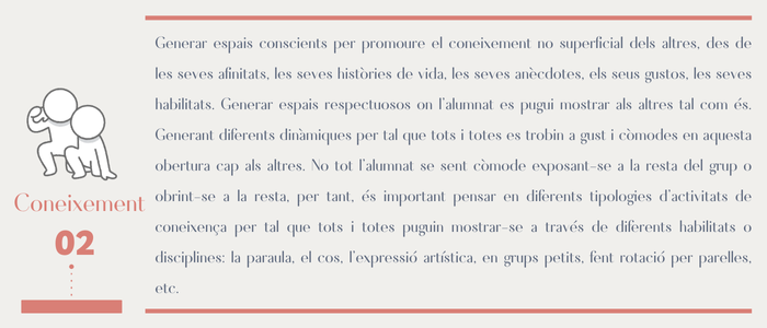 Quan deixem l’espai perquè els infants es mostrin als altres, troben sintonies, vivències semblants, descobreixen habilitats que tenen els altres que els sorprenen i trenquen prejudicis. És una oportunitat pel docent per reforçar aquests descobriments i connexions des de la paraula, creant sinergies entre ells, però també donant lloc perquè observin la diferència des de la cura i d’aquesta manera cuidin la vulnerabilitat de l’altre. Un grup s’enforteix quan coneixen les vulnerabilitats dels seus membres i decideixen cuidar-les.