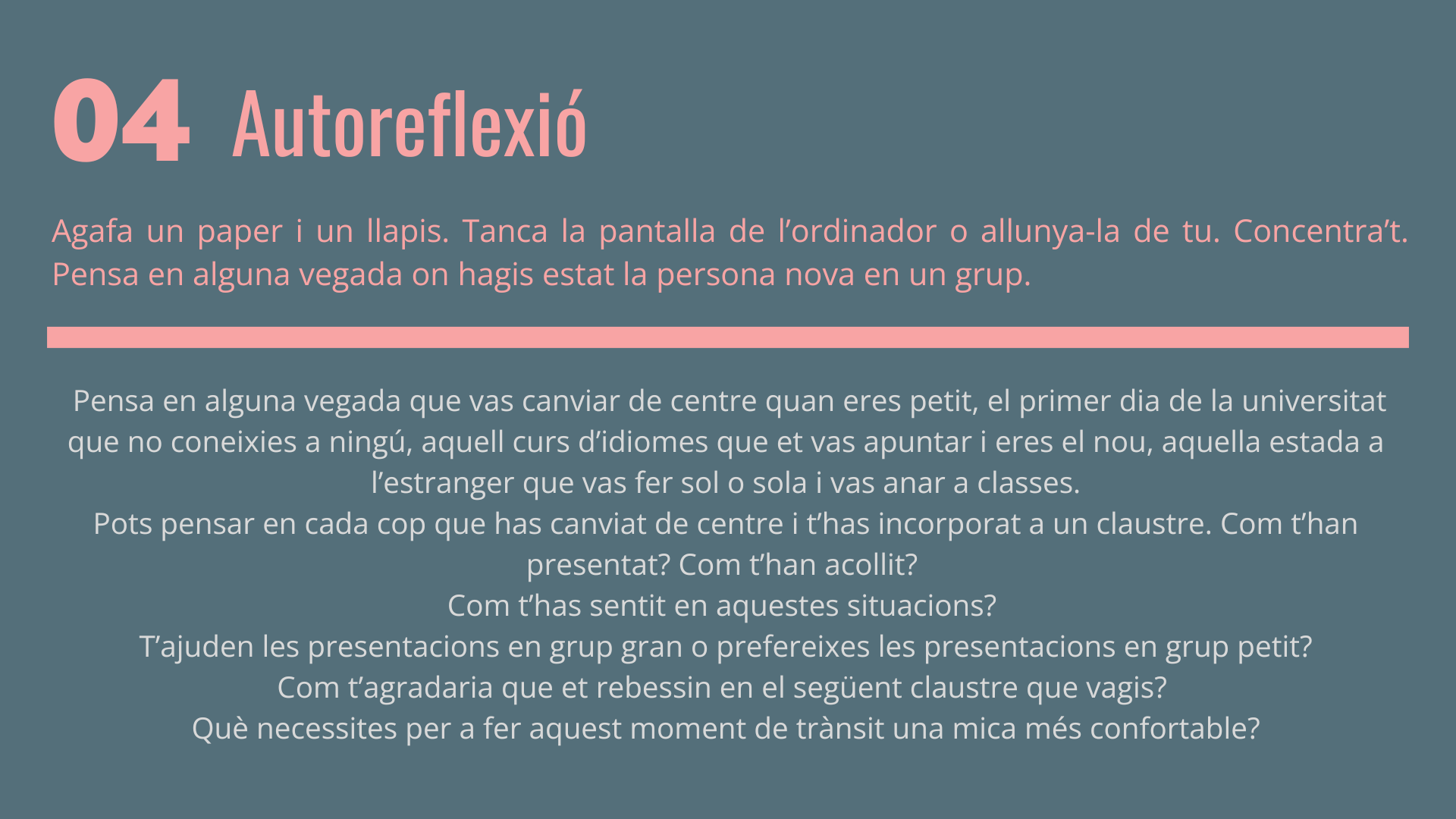 Sovint hem estat exposats a canvis i a processos d’adaptació i creació de grup. Sigui per motius laborals, personals o d’estudis hem hagut de fer l’esforç d’entrar en un espai on no coneixíem a ningú. Afortunats hem estat, les vegades que per atzar hi havia una cara coneguda en aquell lloc, de sobte ens sentíem reconfortats, malgrat que no fossin persones amigues nostres, però en aquell context eren els més coneguts i, per tant, vàlids per a disminuir la nostra incomoditat. Són situacions incertes, incòmodes, que hem viscut al llarg de la nostra vida.