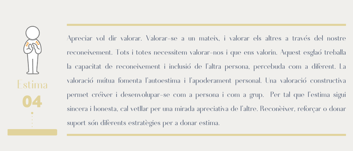 Quan nosaltres valorem la tasca, l’habilitat, la conducta d’un company/a, l’estem incloent, l’estem reconeixent, donant un lloc en el grup des de la seva aportació. Per tal que l’estima sigui sincera i honesta, cal vetllar per una mirada apreciativa de l’altre.
