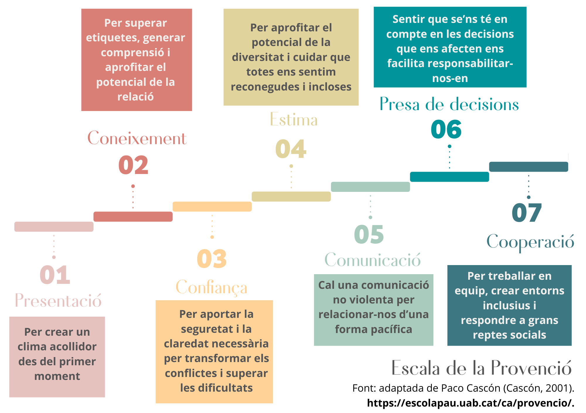 A continuació, desenvolupem els set esglaons de l’Escala de la Provenció (Cascón i Martín, 1996) i us enllaçarem recursos per tal que els pugueu anar desenvolupant amb els diferents grups. Les fonts de les quals hem extret el gran gruix d’informació són Cascón (2007), Escola de Cultura per la Pau i Bartolí, Sanfeliu, & Dulcey, (2019), majoritàriament. Els citem aquí per tal d’evitar citacions constants al llarg de cada paràgraf.