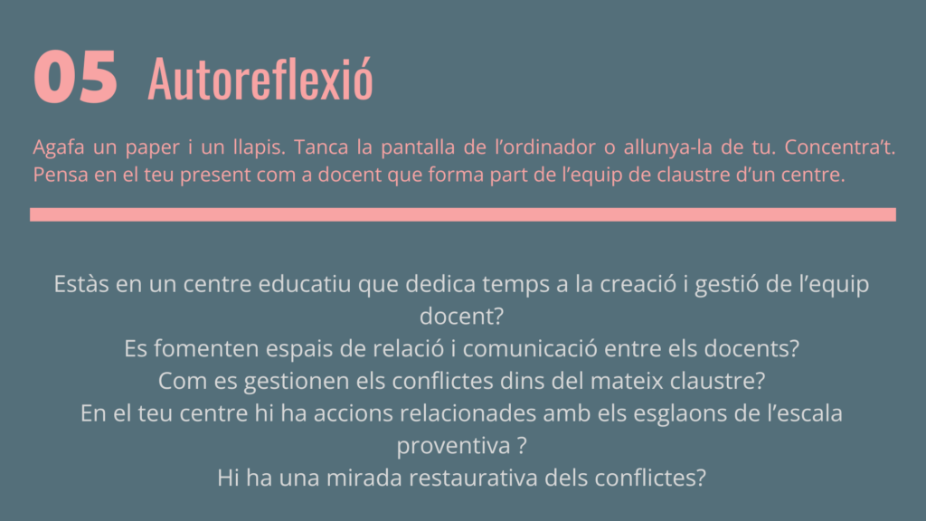 El curs ha començat definint el terme provenció com el conjunt d’actuacions que despleguem per tal de dotar de recursos a les persones perquè s’acostin al benestar i sàpiguen gestionar de forma positiva el conflicte. Fins ara, hem posat la lupa sobre el nostre alumnat, damunt de cada grup classe, però si allunyem una mica la lupa i mirem el nostre claustre, el centre en el qual estem treballant, podríem dir que és un centre que vetlla pel benestar i la gestió positiva del conflicte? A continuació us proposem una aturada per pensar: