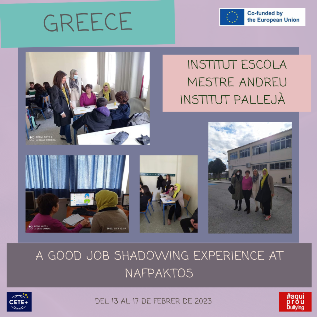Mobilitat a Grècia Servei Escola i Famílies07/03/23 Professors de l’institut escola Mestre Andreu i de l’institut Pallejà, que participen de l’Erasmus+ visiten una escola a Nafpaktos per conèixer diferents metodologies en relació amb l’abordatge de l’assetjament escolar.