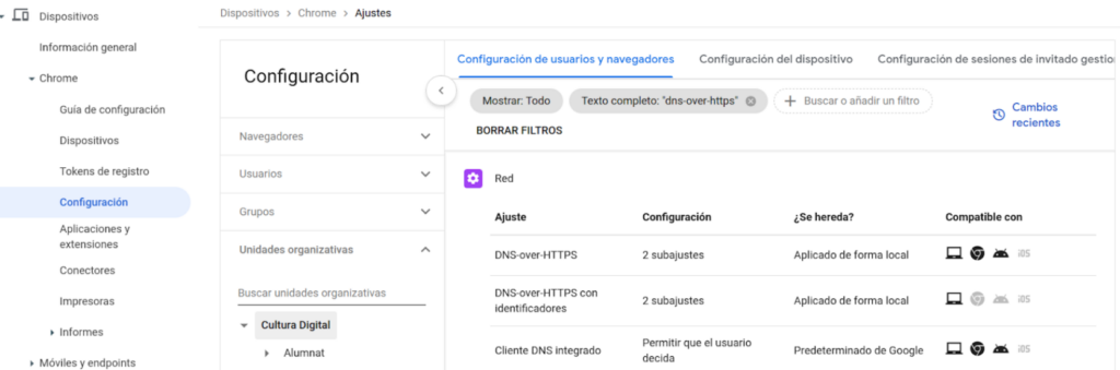 En el cas dels equips Chromebooks, cal que el centre educatiu configuri el camp DNS-over-HTTPS a la consola d’administració de workspace on està registrat l’equip Chromebook.IMPORTANT: Aquest canvi s’hauria d’aplicar per a tot el domini (tots els usuaris) i, per tant, caldrà seleccionar el domini al selector d’unitats organitzatives.