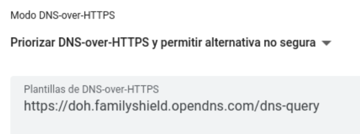 i escollir la configuració Prioritzar DNS-over-HTTPS y permitir alternativa no segura. El camp Plantilla de DNS-over-HTTPS cal emplenar-lo amb la URL https://doh.familyshield.opendns.com/dns-query tal com es pot veure en aquesta altra imatge: