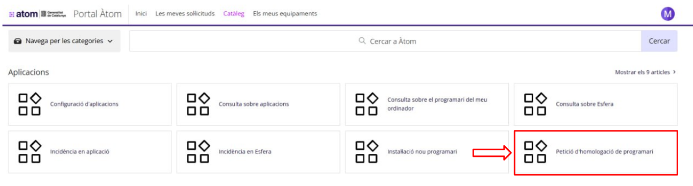 Si no trobeu l’aplicació desitjada, l’equip directiu o el coordinador digital del vostre centre podrà sol·licitar l’homologació i posada a disposició de l’aplicació no disponible realitzant la petició portal ÀTOM (https://atomgencat-dwp.onbmc.com) i justificant la necessitat, omplint el formulari corresponent.