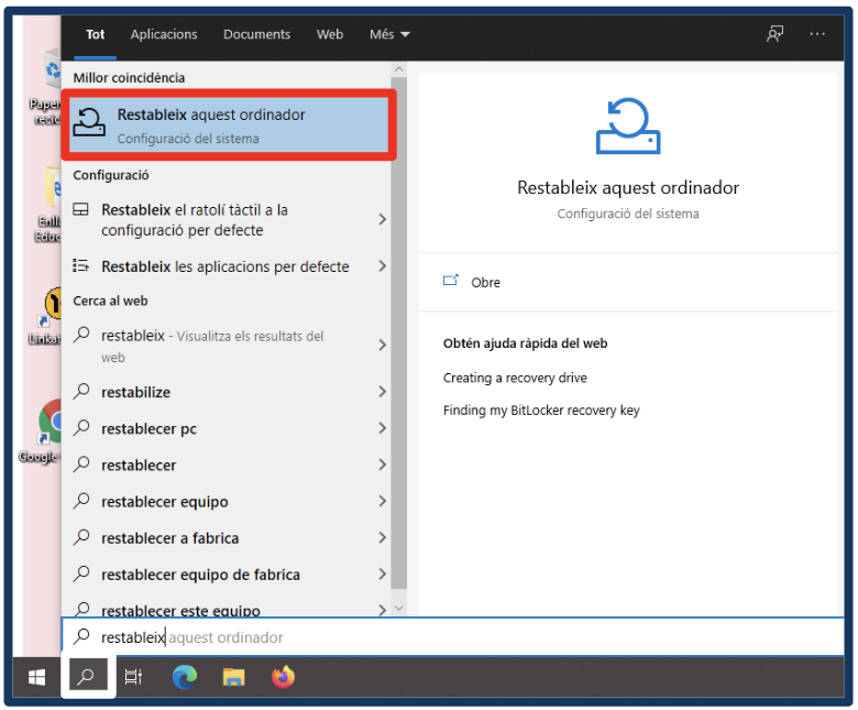 1. Escriu “restableix” en el cercador i fes clic a l’opció Restableix aquest ordinador