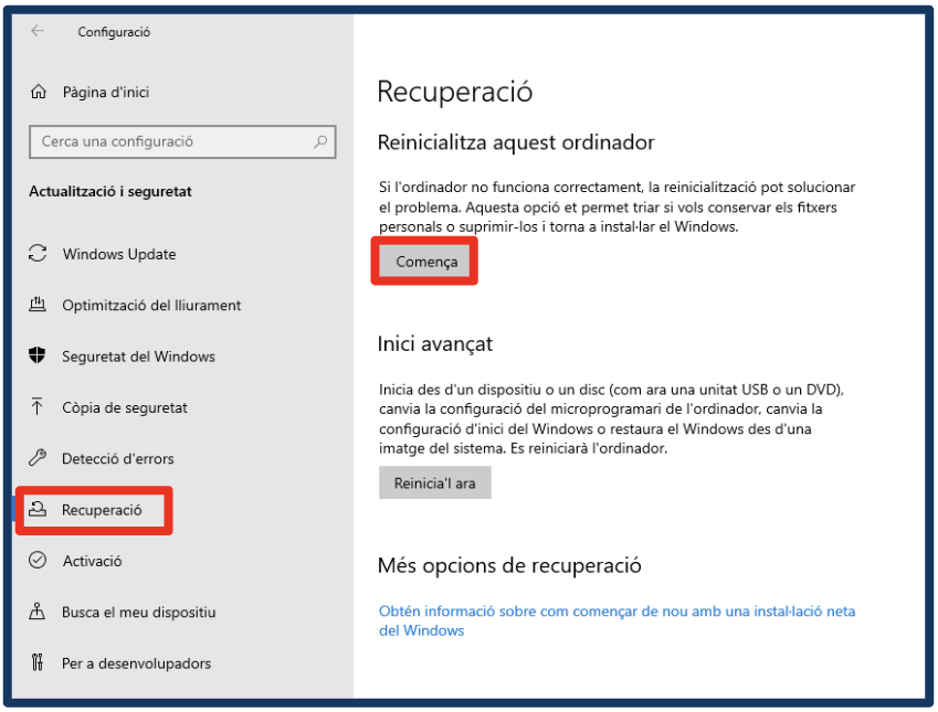 Això començarà el procés de Recuperació, que consisteix en l’esborrat i reinstal·lació bàsica de l’equip.