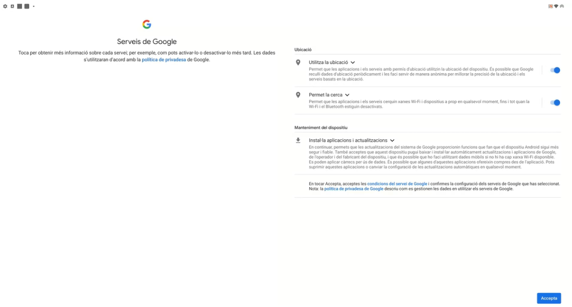 A la següent pantalla de permisos, assegureu-vos de no canviar cap configuració per assegurar un funcionament correcte del sistema i feu clic al botó Accepta.