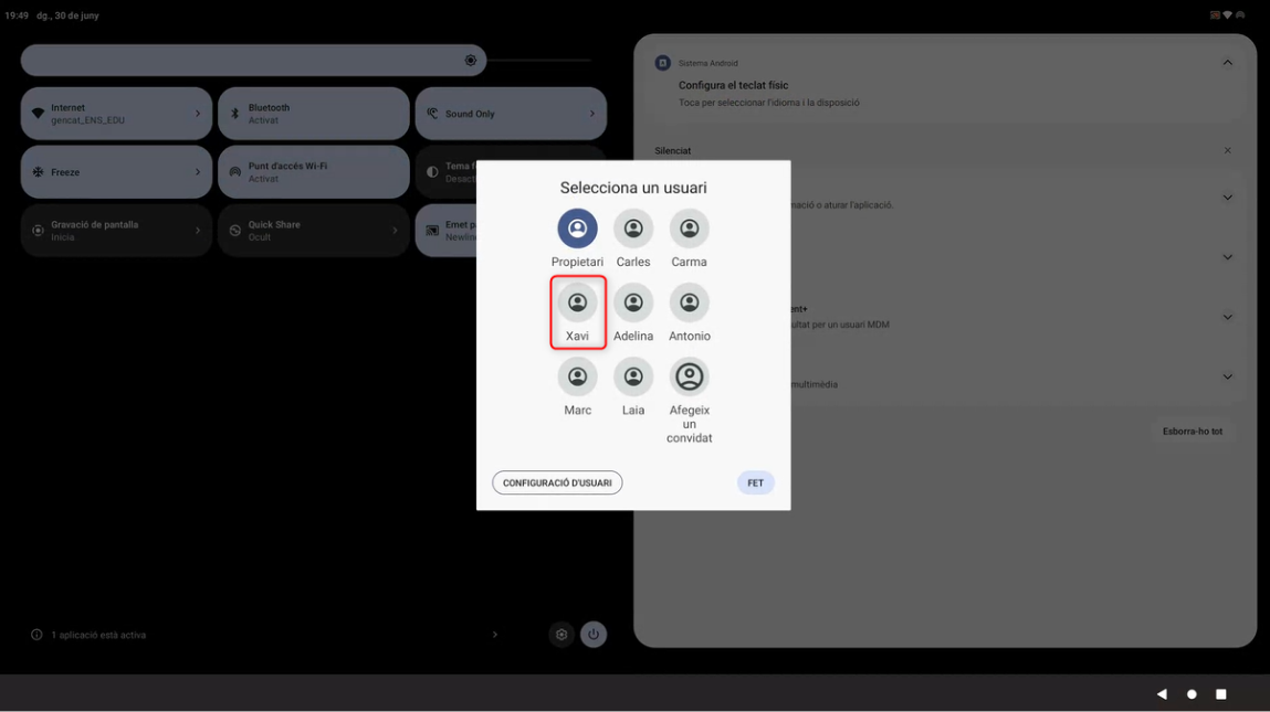 En aparèixer els usuaris, feu clic sobre l’usuari a configurar. El panell canviarà la sessió i proporcionarà l’accés a l’usuari seleccionat.