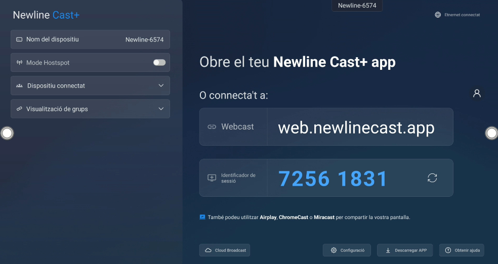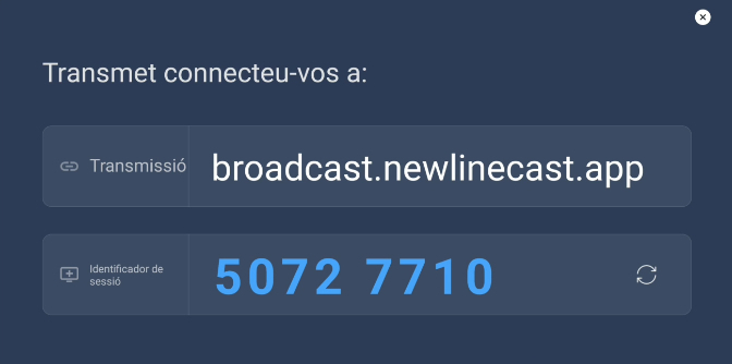 Per enviar la pantalla de l’ordinador o d’algun altre dispositiu al panell cal accedir des de l’ordinador a la pàgina web web.newlinecast.app i, tot seguit, s’ha d’introduir el codi ID de la sessió de 8 dígits.