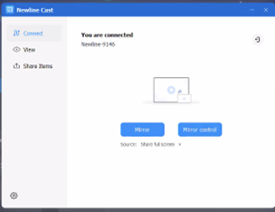 Per gaudir d’aquesta opció cal que el panell i el dispositiu emissor estiguin connectats a la mateixa xarxa wifi. Amb l’aplicació “Newline Cast” oberta, cal accedir al dispositiu i compartir la pantalla de la forma habitual segons cada cas. El panell accepta tres protocols: