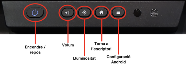 A la part frontal inferior del panell es troben els diferents botons que permeten encendre, apagar o deixar el panell en mode repòs, modificar el volum i la lluminositat, tornar a l’escriptori i accedir a la configuració Android.