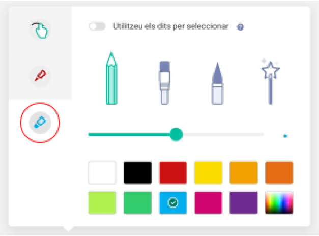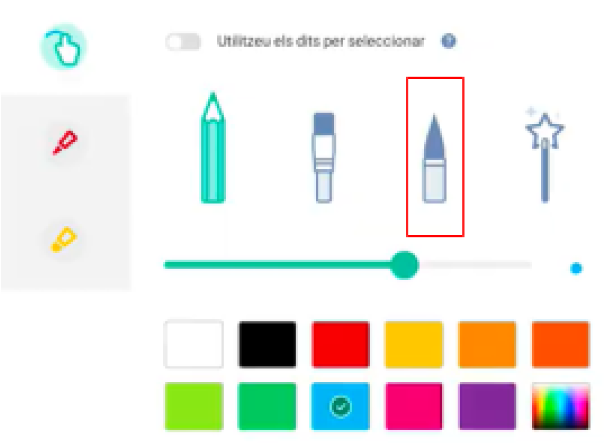 Llapis: per fer-lo servir cal clicar a la icona del llapis tal com es mostra a la imatge. Es pot escollir un color per pintar amb el dit, un altre per la punta de llapis fina i un darrer per la punta gruixuda. També es pot modificar el gruix i color del traç.