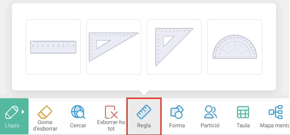Per utilitzar-los, s’ha de seleccionar un regle del menú desplegable com es mostra a la imatge i col·locar-lo a la pissarra. Es pot modificar la mida i orientació dels regles.