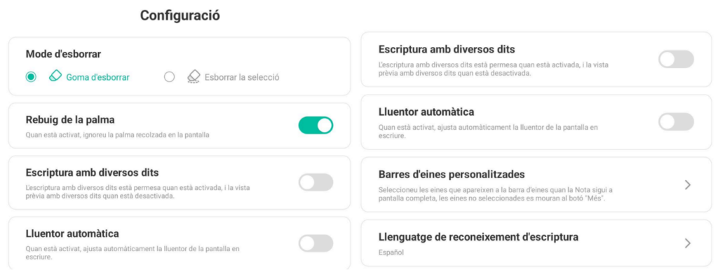 Configuració: Inclou diverses opcions, entre les quals es destaca “Llenguatge de reconeixement d’escriptura”, amb què traços fets a mà es poden convertir en text digital.