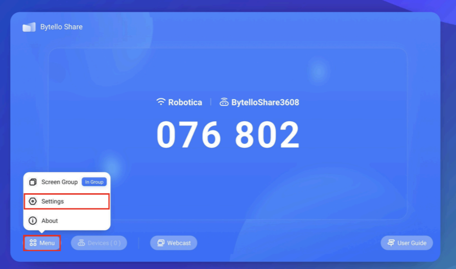 En segon lloc, obrir l’aplicació “Bytello Share” i comprovar que l’opció que volem fer servir està activada a la configuració de Bytello Share del panell. En cas de dubte, es poden activar totes les opcions, tot i que el panell consumirà més energia. Per revisar aquesta configuració, obre Bytello Share, clica a “Menu” i després a “Settings” i selecciona les opcions que calguin.