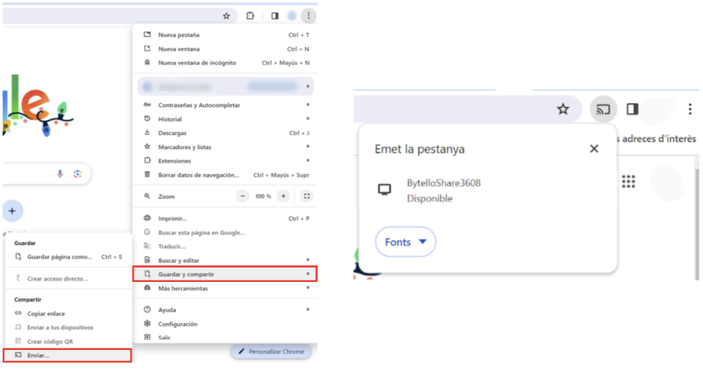 Des del navegador Chrome de l’ordinador, fer clic als tres punts i després clicar a “Emet…”. Seleccionar el nom del panell i a l’apartat “Fonts per seleccionar”, si es vol, compartir una pestanya o tot l’escriptori.