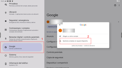 - Seguidament, s’ha de buscar la categoria “Google” del menú lateral i després s’ha de fer clic sobre “Gestiona el teu Compte de Google” – “Gestiona comptes en aquest dispositiu” – “Suprimeix el compte”.