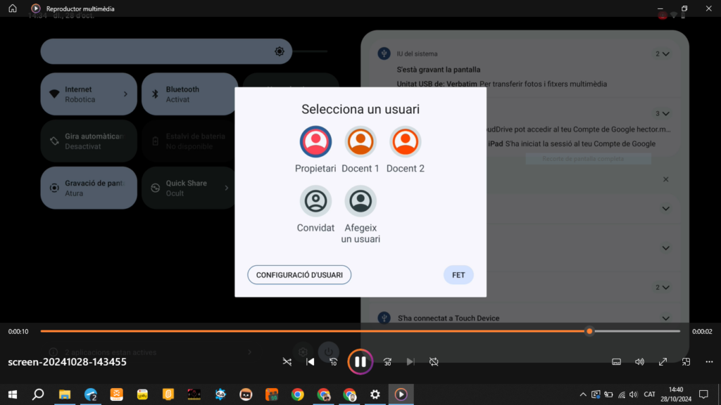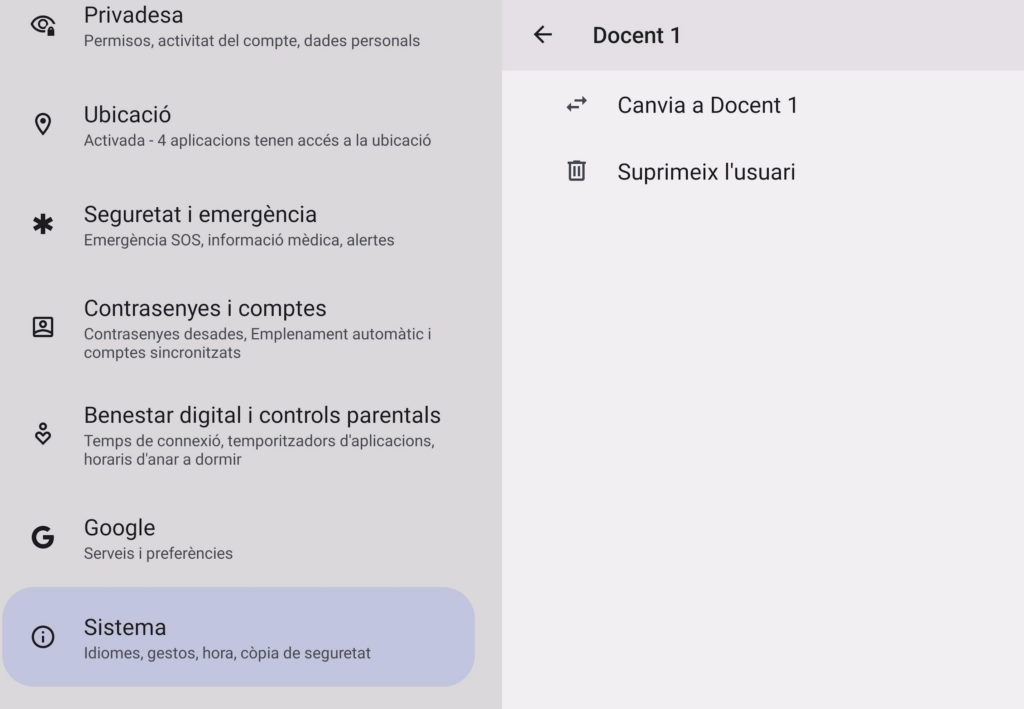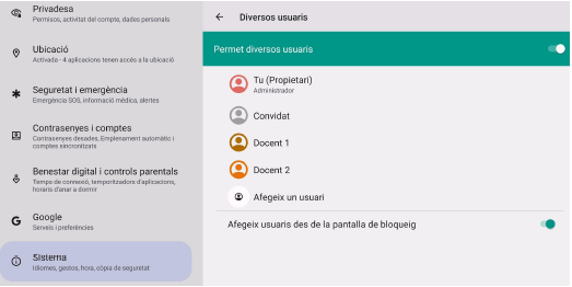 - Canviar d’usuari: es pot canviar d’usuari accedint novament a la configuració de l’usuari. Per accedir-hi, s’ha de desplegar el menú superior de la interfície i seleccionar la icona de la roda d’engranatge. Un cop oberta, podem triar entre els diferents usuaris dels quals disposa el panell.